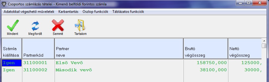 Lehetőség van a programban egy-egy vevőhöz bizonylat típusonként külön-külön számlázási tételeket felvinni, és ezekkel a tételekkel bizonylat típusonként csoportosan számlákat kiállítani. Csoportos számlázáskor minden vevő felé kiállítjuk a számlát, akihez korábban rögzítettünk tételeket az adott időszakra.
