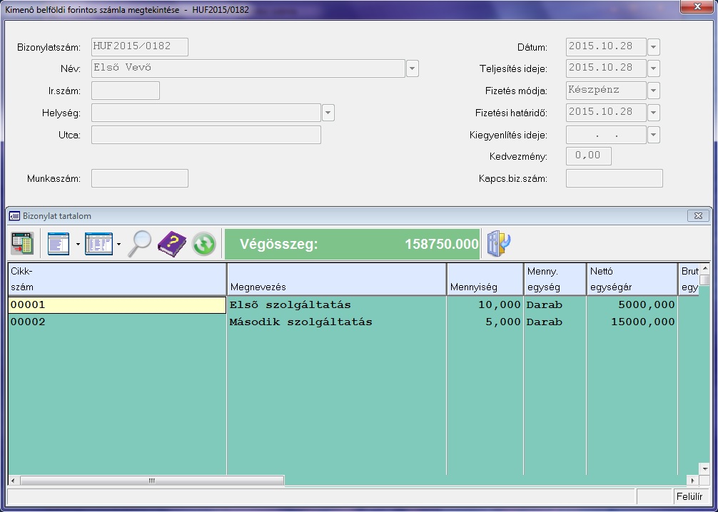 Az Ismétlődő bizonylatok kiállítása előtt lehetőség van a kiállítandó bizonylatok megtekintésére táblázatos módban. Itt a Bizonylat műveletek menüpontban is megszokott megjelenítéssel találkozhatnak. Az egyes bizonylatok tételeit a "Tartalom" gombra kattintva tekinthetik meg, mely során megjelenik a már korábban megszokhatott osztott képernyős bizonylat megjelenítés.