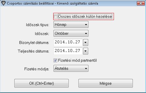 Összes időszak külön kezelése: Amennyiben külön dátumra szeretné számlázni a havi és külön pl. a negyedéves számlákat, úgy pipálja be ezt az opciót. Ez abban az esetben szükséges, ha mondjuk egy adott hónapra több időszak is be van állítva, de azt adott hónapon belül különböző dátumra szeretnék kinyomtatni. Ha a jelölőnégyzet nincsbeállítva, és a számlázott időszakra több időszak beállítás is tartozik (pl. havi és negyedéves is ugyanabban a hónapban), akkor a rendszer külön számlát generál időszakonként (pl. külön számlát a havi rendszerességhez és külön számlát a negyedéves rendszerességhez).