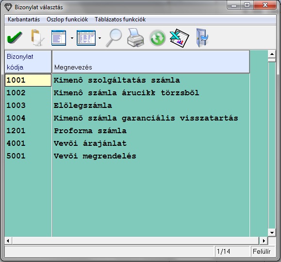 A menüpont indítása után először ki kell választani a bizonylat típust. Bizonylat típusonként külön-külön van lehetőség ismétlődő számla tételek felvitelére különféle időszakokra. Azok a bizonylattípusok, amelyekhez már van megadva adat, kiemelt színnel jelennek meg a választó ablakban.