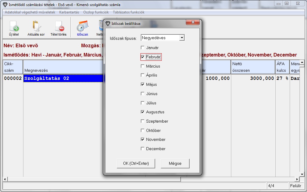 Alap esetben, ha nincs beállítva az időszakok külön kezelése, akkor egyszerre állítható ki az összes számla, mely az adott hónapra esik, függetlenül attól, hogy az pl negyedéves vagy havi ismétlődésű.