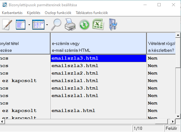Ezt követően a Bizonylat/Működési paraméterek beállítása/Bizonylattípus beállítása menüpont megnyitását követően keresse meg azt a bizonylat típust amely mellé szeretné a kísérő szöveget.