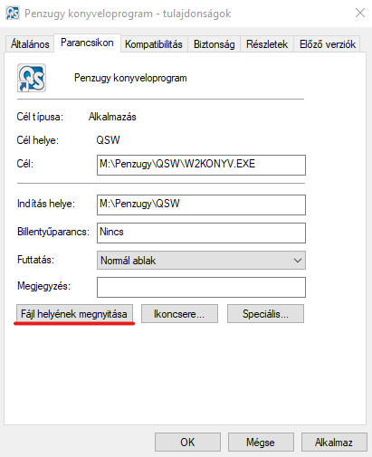 Kattintson a parancsikonra, (amellyel indul a program) jobb egérgombbal, majd a Tulajdonságok menüpont megnyitását követően megjelenő ablakban kattintson a "Fájl megnyitása" gombra, hogy így elérje a program főkönyvtárát ahová be kell másolni a fent említett html állományt.