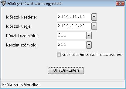A paraméterek beállítása után lekérve a listát bizonylat számonként kigyűjti az adott intervallumra a készlet számlákhoz tartozó Tartozik és Követel értékeket, valamint megjeleníti az ezekből kapott egyenleget. Itt a készlet program beállításainak megfelelően csak azok a bizonylattípusok gyűjtődnek, melyekhez főkönyvi készletérték változás van beállítva.