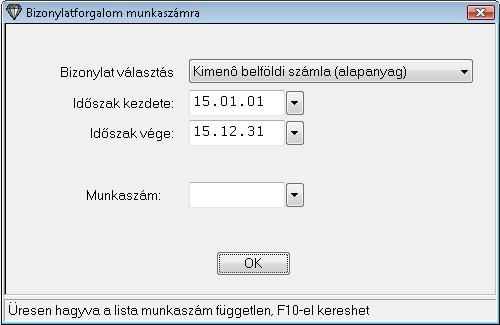 A Listázások / Munkaszám kimutatások / Bizonylatforgalom munkaszámra menüpontból a megadott munkaszámra és dátum intervallumra cikkenként csoportosítva kérhető le egy részletezés.