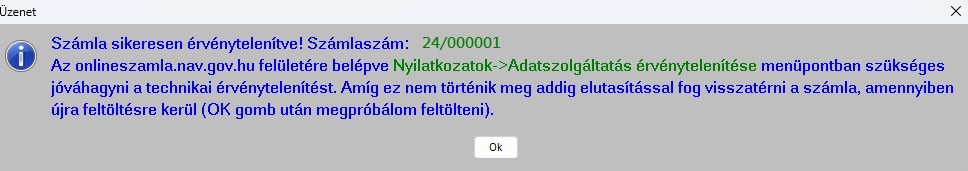 Ezt követően megjelenik egy "Számla sikeresen érvénytelenítve!" ablak, amit csak akkor kell leokézni ha az onlineszámla felületén elfogadásra került az adatszolgáltatás érvénytelenítése.