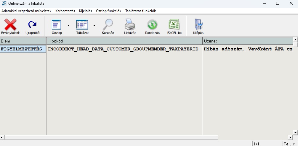 Az adatszolgáltatás érvénytelenítéséhez az érintett számla státuszán enterezve megjelenik a képen látható ablak jelenik meg, akkor ha a számla státusza "Figyelmeztetés", ebben az ablakban az "Érvénytelenít" piros ikonra szükséges klikkelni :
