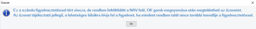 Még egy státusz van, ami a "Figyelmeztetés", amely esetben szintén feltölti a számlákat a program, csak a számla adattartalmát tekintve, valamilyen hiányosságot vagy helytelenül megadott adatot érzékel a NAV szervere. Ebben az esetben is meg lehet tekinteni egy listát a problémákról az Online számla státusz oszlopban enter billentyű lenyomásával.