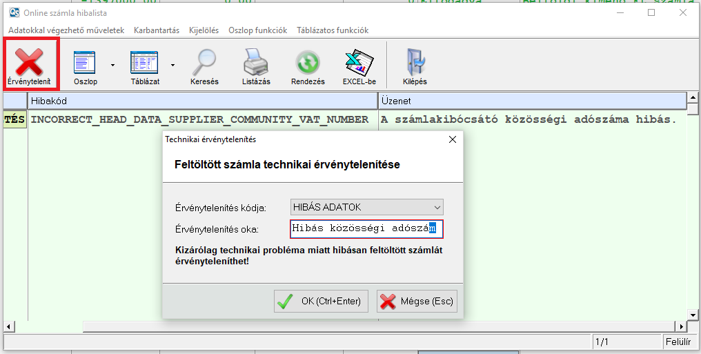 A programban van lehetőség technikai érvénytelenítésre is  Erre akkor van szükség mikor a számla helyes, de a NAV felé történő adatszolgáltatás hibás adatokkal valósult meg technikai probléma következtében. Az érvénytelenítés elvégzését követően a program automatikusan feltölti ismét a számlát, ez két státusz esetében tehető meg az egyik az "Elfogadva", míg a másik a "Figyelmeztetés"esetén.