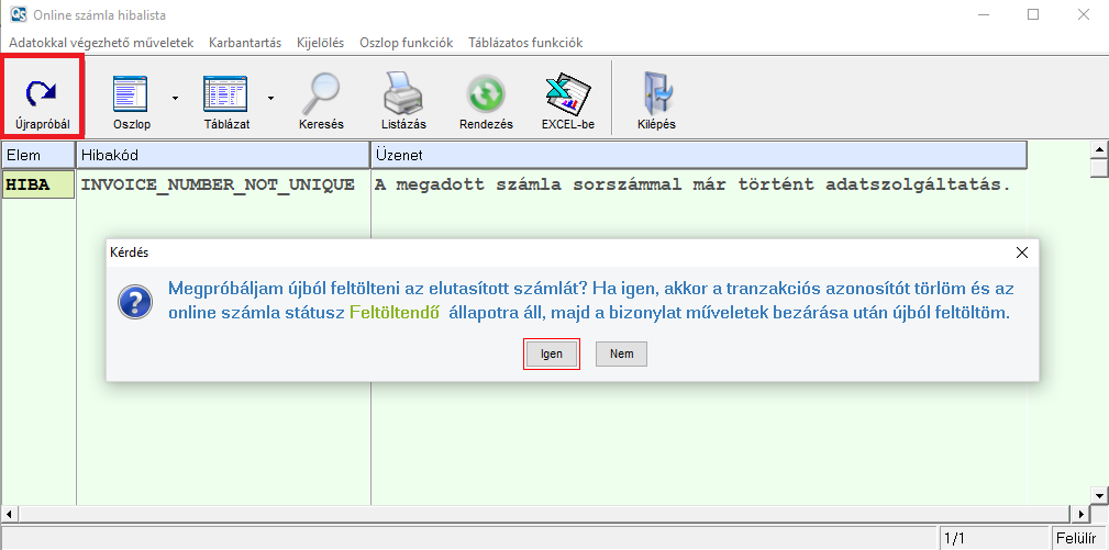 A megjelenő ablakban az Újrapróbál ikon segítségével lehet ismét megpróbálni a feltöltést. Ha található olyan számla, amely elutasításra került akkor mindenképpen töltsön le egy új verziót a programból a QSNETSZERVER ikon 1. pontjának segítségével, amelyhez a ki kell lépni a Bizonylat műveletek menüpontból, majd a letöltést követően az előbb említett módon próbálja meg ismét feltölteni a számlát az Újrapróbál ikonnal. Ha ezt követően ismét hibát jelezz akkor kérjük jelezze a problémát az ügyfélszolgálat felé.
