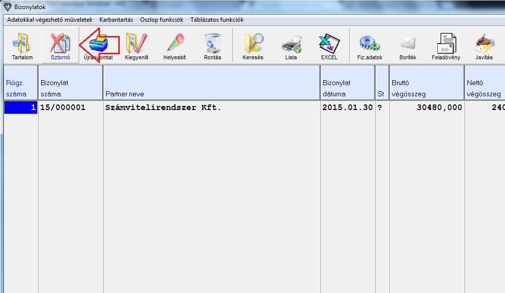 Már meglévő bizonylat esetén "Bizonylat / Bizonylat műveletek" menüpontban a érvényteleníteni kívánt bizonylatra kell állni, és az F6 billentyűt vagy a Sztornó gombot kell megnyomni. Ebben az esetben a program készít egy új sorszámú bizonylatot a régi számla alapján, az eredeti pedig érvénytelenített lesz. Ha van főkönyvi feladás is, akkor a könyveléshez szükséges tételek is rögzülnek.