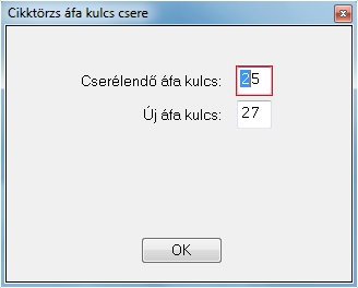 ÁFA kulcs változás esetén van lehetőség programunkban egyszerre az összes adott ÁFA kulccsal rendelkező cikkünkben (árucikk vagy szolgáltatás) való lecserélésre.