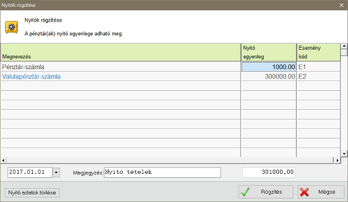 A nyitók rögzítésére szolgáló ablakban mindne sorra vonatkozóan megadható a nyitás dátuma és a nyitó sorok megjegyzése. Ezek mellett a látszik egy összesítés a nyitó egyenlegekről. A táblázatban az "Esemény kód" megadása abban az esetben fontos, ha egy esemény kontírkódra szűrő listán van szükség a nyitó megjelenítésére.