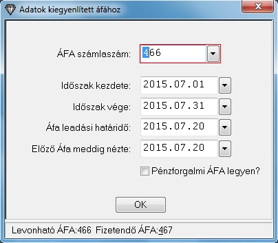 A menüpontra kattintva egy érték bekérő ablak ugrik fel. Ebben az ablakban adhatjuk meg, hogy mely ÁFA számlát listázza a program, mely idő intervallumba és mikori az ÁFA leadás határideje és mikor volt az előző-é, valamint beállíthatjuk, hogy a pénzforgalmi ÁFA-s tételeket is listázza.