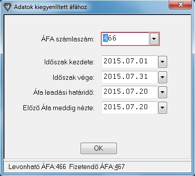 Ebben az ablakban adhatjuk meg, hogy mely ÁFA számlát listázza a program, mely idő intervallumba, mikori az ÁFA leadás határideje és mikor volt az előzőé.