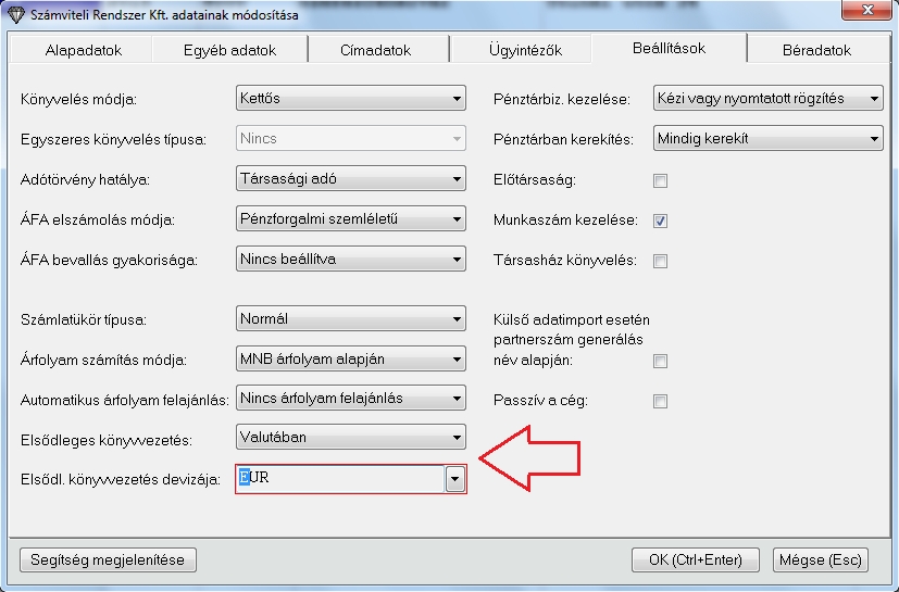 Ezt a Karbantartások / Könyvelt cégek karbantartása menüben tehetik meg, az adott cég módosítás vagy felvétel ablakában a beállítások fülön, ahogy az az alábbi képen is látható. (FONTOS: Ha az "A" cégben szeretné az elsődleges könyvvezetést módosítani, akkor csak abban az esetben lesz aktív a beállítások fülön az "Elsődleges könyvvezetés" mező ha az "A" céget választja ki a programba való belépéskor vagy a Könyvelés\Könyvelendő cég választás menüben.)