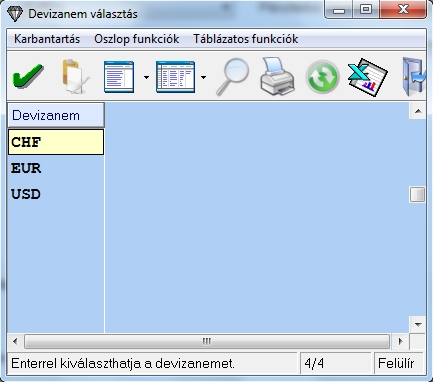 Ezen a fülön adhatjuk meg a könyvvezetés nemét: Forint vagy deviza. Ha devizát választjuk akkor meg kell adnunk deviza típusát is. Ezt a deviza adatok karbantartása menüben felvitt deviza nemek közül tudjuk kiválasztani.