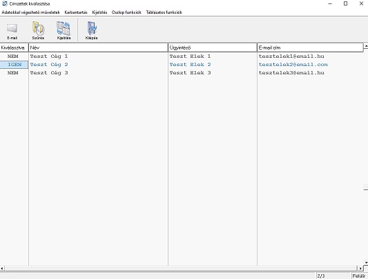 Azt, hogy kinek szeretnénk küldeni az e-mailt, az aktuális soron állva enterezéssel jelölhetjük ki. A sor elején található 'Kiválasztva' oszlop jelzi, hogy kiket jelöltünk már ki. Ha egy sor már ki van jelölve azt a program eltérő színnel is jelzi.