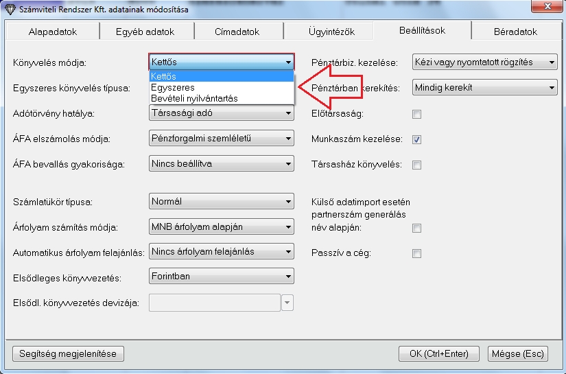 Programunk több lehetőséget biztosít könyvelt cégenként a könyvelési módjára. Ezt cégenként külön külön állítjuk be.
