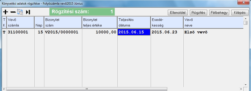 A könyvelési ablak fejrészben tudjuk legelőször megadni azt hogy a vevő főszámla a tartozik vagy követel oldalára szeretnénk az első tételt rögzíteni, majd ezután beírhatjuk vagy kiválaszthatjuk az F10 gomb segítségével a vevő folyószámláját, majd megadhatjuk a bizonylatszámot, a könyvet hónapon belüli napot és a teljesítés dátumát, valamint az esedékesség dátumát. A bruttó érték mezőbe írjuk be a vevő számla vagy tétel teljes értékét és ekkor automatikusan átkerülünk az alsó táblázatba ahol a bizonylat megbontását vihetjük fel. A bruttó érték mezőt üresen is hagyhatjuk, és akkor később kitöltődik. Ebben az esetben a jobb felső sarokban található "Ellenoldal" nevű gombra kattintva is megkezdhető a bizonylat megbontásának felvitele.