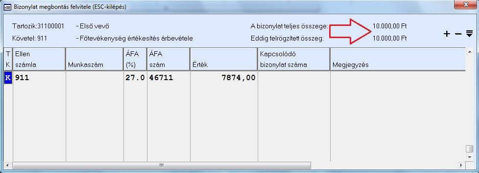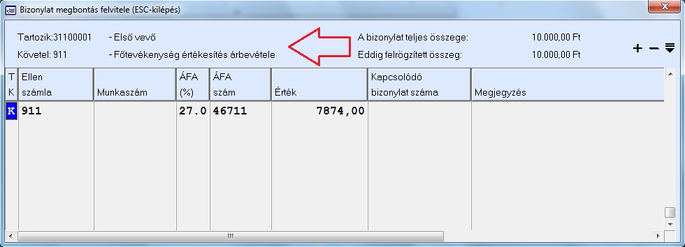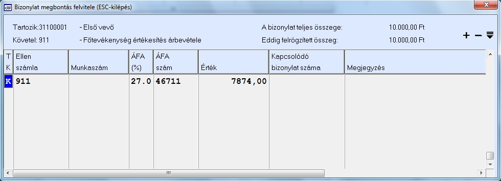 A hibásan rögzített sor a - gomb segítségével törölhető a táblázatból. Amennyiben végeztük az ellenoldali tétel(ek) felvitelével akkor ez ESC gomb segítségével, vagy egérrel az ablakzáró X gombra kattintva rögzíthetjük az ellenoldal tételeit. Ha a felső táblázatban megadtuk a bizonylat teljes összegét, akkor addig nem engedi rögzíteni a megbontott tételeket a rendszer amíg a felrögzített összeg eltér a teljes összegtől. Ha minden rendben van akkor a tétel rögzítésre kerül a felviteli állományba és visszakerülünk a felső táblázatba.
