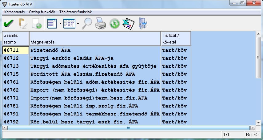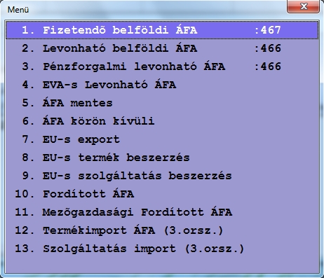 Ezután adatjuk meg ha áfás tételről van szó az áfa %-ot, és az áfa típusát valamint az áfa számlaszámot. Ha nem áfás tételről van szó, hanem például áfa mentes tételről, akkor egyszerűen a nyíl gombok segítségével lépjük át az adott áfa mezőket.