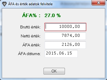 Ezután az érték megadó ablakba jutunk ahol beírhatjuk a tétel bruttó, illetve nettó és áfa összegét. A bruttóból a nettó automatikusan kiszámítódik. Amennyiben a bruttót nullán hagyjuk és a nettó értéket adjuk meg akkor abból a bruttó és az áfa visszaszámolódik.