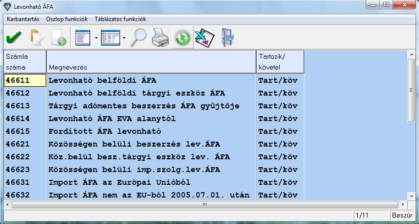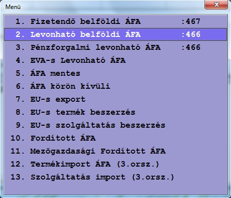Ezután adatjuk meg ha áfás tételről van szó az áfa %-ot, és az áfa típusát, valamint az áfa számlaszámot. Ha nem áfás tételről van szó, hanem például kiegyenlítésről, akkor egyszerűen a nyíl gombok segítségével lépjük át az adott áfa mezőket.