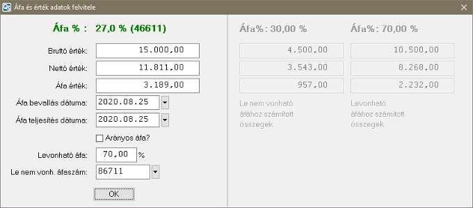 Ezután az érték megadó ablakba jutunk ahol beírhatjuk a tétel bruttó, illetve nettó és áfa összegét, valamint megadhatjuk, hogy az ÁFA hány százaléka levonható és ekkor a program ezt kiszámolja és megjeleníti (Ez például telefon költség könyvelésekor fontos!). A bruttóból a nettó automatikusan kiszámítódik. Amennyiben a bruttót nullán hagyjuk és a nettó értéket adjuk meg akkor abból a bruttó és az áfa visszaszámolódik.