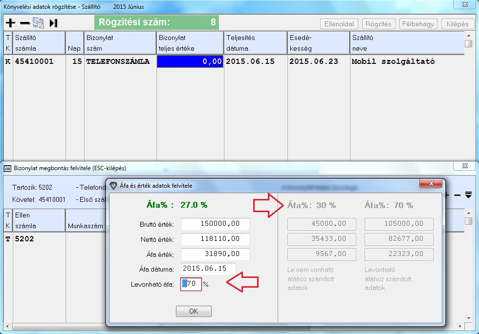 Programunkban ezt úgy könyveljük, hogy bejövő számla könyvelésében megadjuk a könyvelt számla adatait, és levonható áfát választunk az áfa táblázatból. Az érték bekérő ablakban megadjuk a számla teljes nettó, bruttó és áfa értékét, majd beírjuk hogy ebből a teljes összegből hány % a levonható áfa és a program megjeleníti az ÁFA szétbontását.