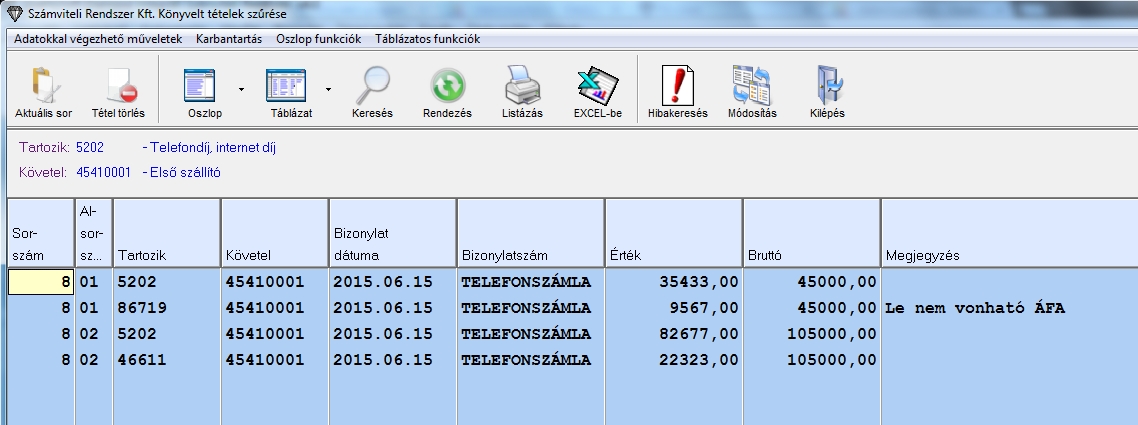 A fenti képen látható hogy levonható áfához 70%-ot írunk be. Ekkor automatikusan lekönyvelődik a tétel 70-30%-os felosztásban. Az összegeket a rendszer kiszámolja Önnek nem kell vele foglalkozni. A 30% automatikusan le nem vonható áfás. Ezt a 30%-ot a rendszer nem a 466 főkönyvi számlára, hanem a 8-as valamely alábontására, például a 867 le nem vonható áfa számlára könyveli (beállítástól függően mely a rendszer beállítási táblázatban változtatható meg). A lekönyvelt tétel így fog kinézni, ellenőrizhetjük a könyvelt tételek szűrése menüpontban: