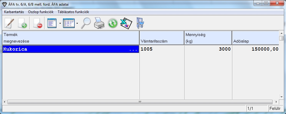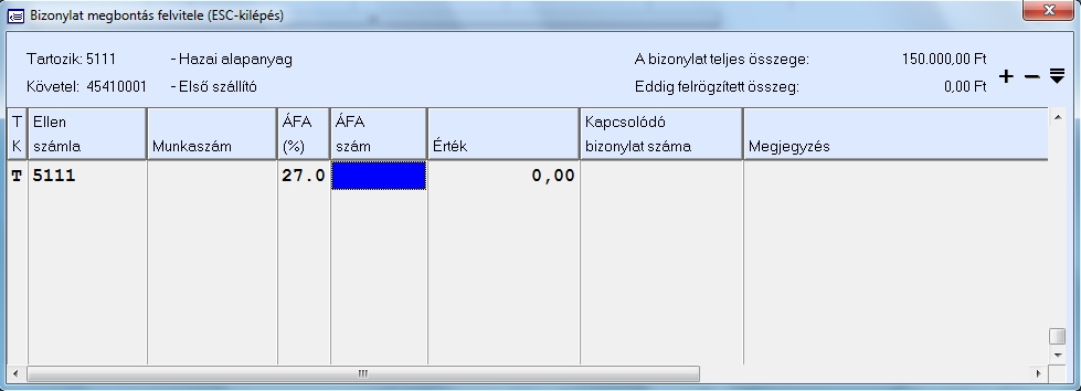 Miután ezt is megadtuk a táblázat utolsó mezőjében adhatjuk meg a mezőgazdasági áfára vonatkozó adatokat, melyek a következők: termék neve, vám tarifa szám, mennyiség, adóalap és hibrid vetőmag. Ha ez utóbbit beállítjuk, akkor az áfa bevallásban a termék mennyiségénél az NY jelzés fog megjelenni. Devizás könyvelési képernyőn ebben a táblázatban van egy devizás adóalap mező is, ami arra szolgál, hogy a megadott árfolyam felhasználásával kiszámolja a rendszer a forintos adóalapot, amit majd ténylegesen rögzít is a könyvelésbe. Forintos s devizás könyvelés esetében is igaz, hogy az újabb részletező adat sorának létrehozásánál a rendszer felajánlja a könyvelési tétel adóalapjából még fennmaradó összeget.