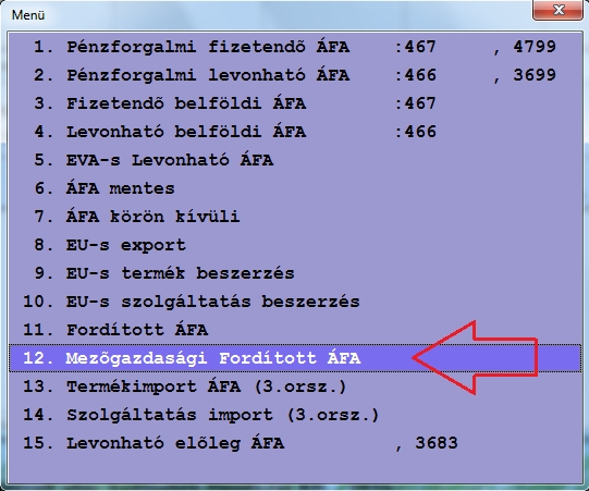 Könyvelő programunk könyvelés közben kezelni tudja a mezőgazdasági fordított áfát a törvényi előírásnak megfelelően. Kezelését könyvelés közben tudjuk beállítani. Ehhez a Könyvelés / Vevő vagy Szállító folyószámla könyvelés menüpontot kell elindítanunk.