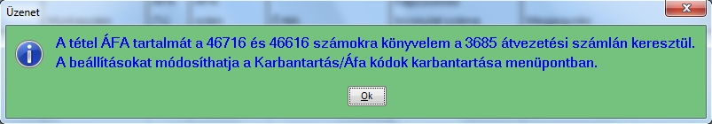 Miután ezeket megadtuk adhatjuk meg az áfa típusát az adott tételnél, mely esetünkben a mezőgazdasági fordított áfa lesz. Miután kiválasztjuk egy figyelmeztető üzenet értesít minket, hogy ezt az ÁFA kódot választottuk és kiírja, hogy milyen átvezetési számlán fogja lekönyvelni az áfa tartalmat az ÁFA számlákra.