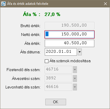Ezután az érték megadó ablakba jutunk ahol beírhatjuk a tétel bruttó, illetve nettó összegét. A bruttóból a nettó automatikusan kiszámítódik. Amennyiben a bruttót nullán hagyjuk és a nettó értéket adjuk meg akkor abból a bruttó és az áfa visszaszámolódik. (Az áfa számok utólag is módosíthatók a könyvelési képernyő alábbi érték beviteli ablakán az "Áfa számok módosítása" jelölőnégyzet bepipálása után.)