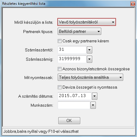 A lista lekérése előtt válasszuk ki, hogy vevőre vagy szállítóra szeretnénk látni az adatokat. Ha csak egy partnert akarunk kilistázni, akkor pipáljuk be az alatta lévő jelölő négyzetet. Ilyenkor a főkönyvi számok megadásánál csak a felső marad aktív, amúgy meg tudunk adni egy tartományt, ha több partner adatát szeretnénk egyidejűleg kinyerni a rendszerből. Az azonos bizonylatszám alá tartozó tételeket tudjuk egy összegben is megjeleníteni, vagy tételesen, attól függően, hogy szeretnénk látni. Lehetőség van arra is, hogy csak a kiegyenlített vagy csak a kiegyenlítetlen tételeket jelenítsük meg. Bepipálhatjuk, hogy ha szeretnénk devizát is látnia a listán, de ehhez kell a deviza modul is. Legalul pedig a számítás dátumát adhatjuk meg, hogy a lista melyik dátumig vizsgálja a könyvelési tételeket, ill. a kiegyenlítéseket.
