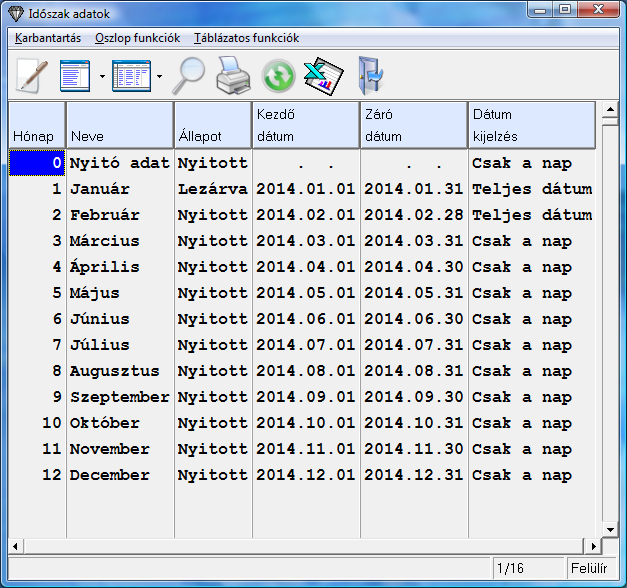 A "Dátum kijelzés" oszlop segítségével hónaponként beállítható, hogy normál könyvelés közben a hónap kiválasztása csak a nap legyen látható vagy a teljes dátum, amiből szintén csak a nap szerkeszthető.