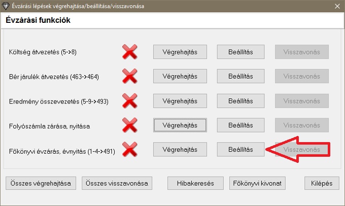 Ezen az ablakon a "Beállítás" gombra kattintva tudjuk megadni a záró és nyitó egyenleg főkönyvi számait, valamint az évzárás (göngyölítés) dátumát.