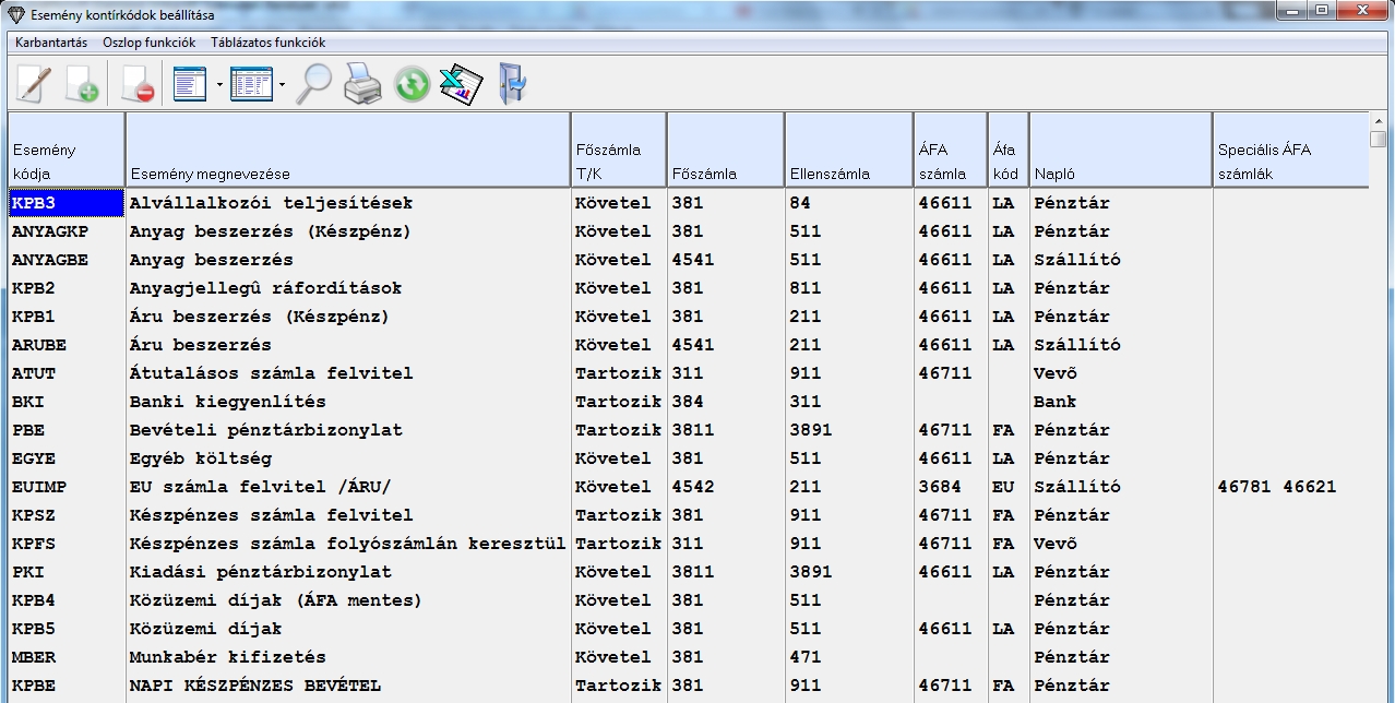 A működéséhez a következő beállításokat kell beparaméterezni. Először indítsuk el a "Karbantartások / Esemény kontírkódok beállítása" menüpontot. Az itt megjelenő ablakban tudjuk beállítani az esemény kódokat.