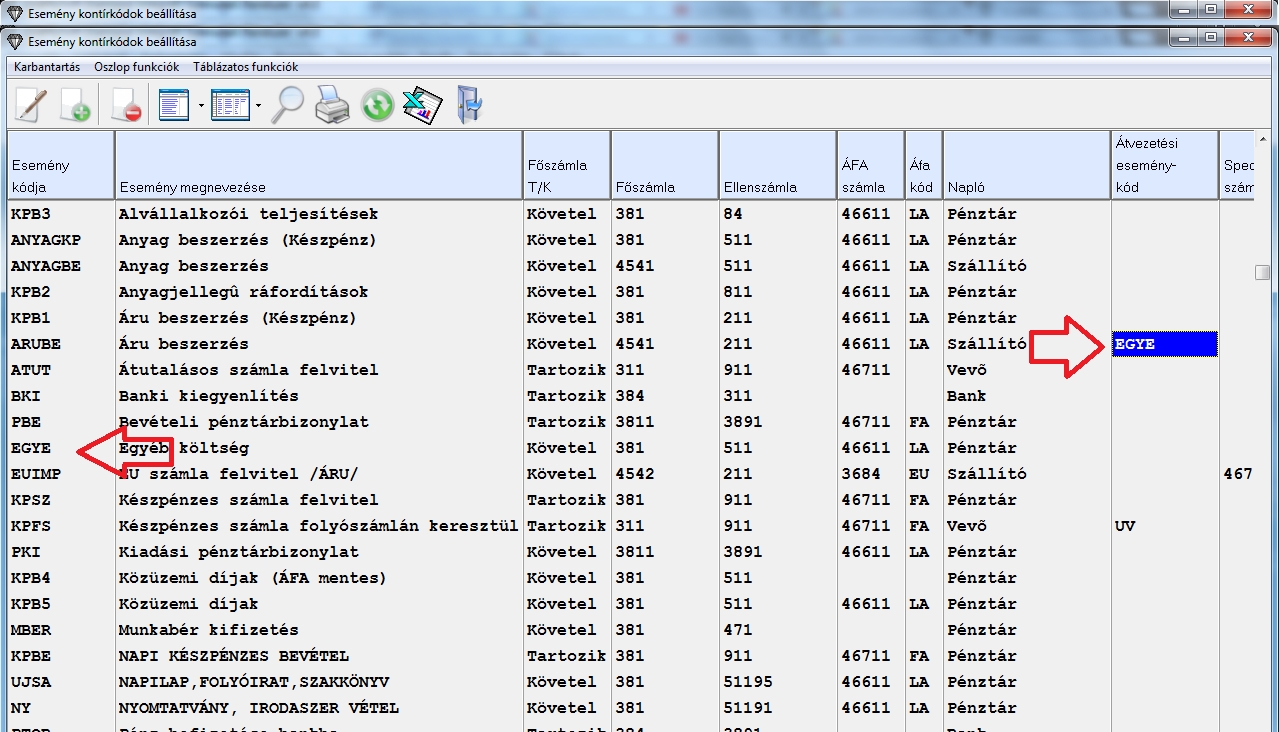 Válasszuk ki a kívánt két esemény kódot. (Példánkban ez a két esemény kód az áru beszerzés és az egyéb költség.) Miután meg van a két esemény kód, írjuk be az egyik esemény "Átvezetési esemény kód" mezőjébe annak az eseménynek a kódját, amelyiket hozzá szeretnénk kapcsolni (lásd a képen).