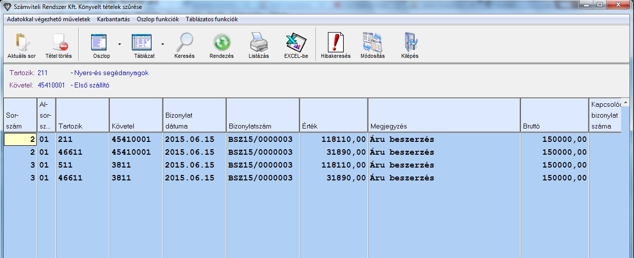 Miután végeztünk a beállításokkal, rögzíthetjük a bizonylatokat az esemény könyveléssel a megszokott módon. (Esemény könyvelésről itt olvashat bővebben.) Rögzítés után ellenőrizhetjük a könyvelt tételek szűrésében, hogy jól rögzültek-e le a tételek. Az alábbi képen látszik, hogyan kellene könyvelődniük a példában szereplő tételeknek.