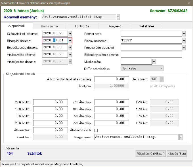 Előfordulhat, hogy esemény könyveléssel szeretne olyan tételt rögzíteni, amelynél eltér a bizonylat keltének és a számvitelli teljesítés dátumának a hónapja. Programunkban ez az alábbi egyszerű módon oldható meg.