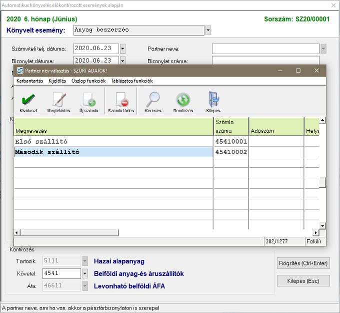 Ha olyan esemény kerül kiválasztásra, ahol a Tartozik vagy Követel oldalon vevő vagy szállító gyökérszám szerepel, akkor a főkönyvi számnál és a "Partner neve" mezőnél is kiválasztható a szükséges partner (ilyenkor nem lehet választani a készpénzes törzsből). Abban az esetben, ha a valamelyik oldalon egy konkrét főkönyvi szám szerepel, akkor azt nem lehet módosítani, és ha ez egy partner főkönyvi száma, akkor a "Partner neve" mezőt is letiltja a rendszer. Az áfa számlaszámához mindenképpen könyvelhető főkönyvi számot kell megadni az események beállítása során, mert az nem módosítható a könyvelési képernyőn.