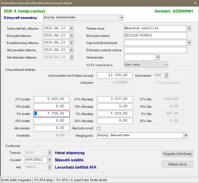 Az összes szükséges adat megadása után a "Rögzítés" gombon enterezve, vagy azon kattintva egy megerősítő kérdést követően rögzíthető a könyvelés. A "Kilépés" vagy az X gombbal egy megerősítő kérdés után a megadott adatok rögzítése nélkül lehet elhagyni az ablakot.