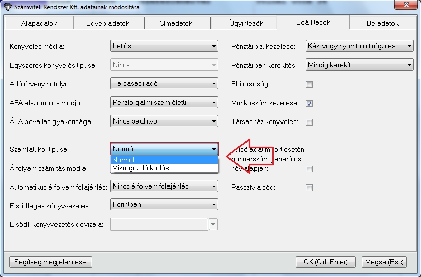 Programunk kétféle számlatükröt tud kezelni, ehhez viszont be kell állítani az adott könyvelt cégnél milyen típusú számlatükröt használ. Ezt a Karbantartások / Könyvelt cégek karbantartása menüpontban tehetjük meg. Itt a módosítás vagy felvétel során felugró ablak beállítás fülén tudjuk megadni milyen típusú számlatükröt használ a program. Ez lehet normál vagy mikrogazdálkodási.