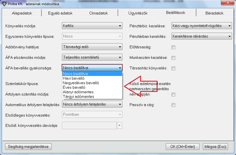 A következőt beállítást kell elvégezni: a karbantartás menüponton állva el kell indítani a könyvelhető cégek karbantartását, itt az adott cégen állva SPACE billentyű vagy az aktuális tétel sor szerkesztése menügomb lenyomásával FORM nézetre kell váltani. Felugró ablakon (FROM nézet) A beállítás fülön az alábbi beállítást kell elvégezni: Havi bevalló / Negyedéves bevalló / Éves bevalló / Alanyi adómentes / Tárgyi adómentes