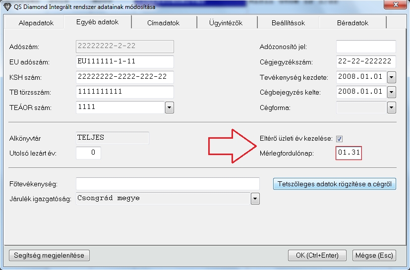 Az üzleti évet könyvelt cégenként adhatjuk meg, vagyis rögzíthetjük mikor esedékes a mérlegforduló napja. Programunkban alapértelmezetten minden könyvelt cégé 12.31, így tehát amely könyvelt cégünk etttől eltér ott be kell kapcsolni, hogy eltérő üzleti éves valamint meg kell adni a mérlegforduló napját. Ezen beállítást a könyvelhető cégek karbantartása menüpontban tehetjük meg. (Karbantartás / Könyvelhető cégek karbantartása.)
