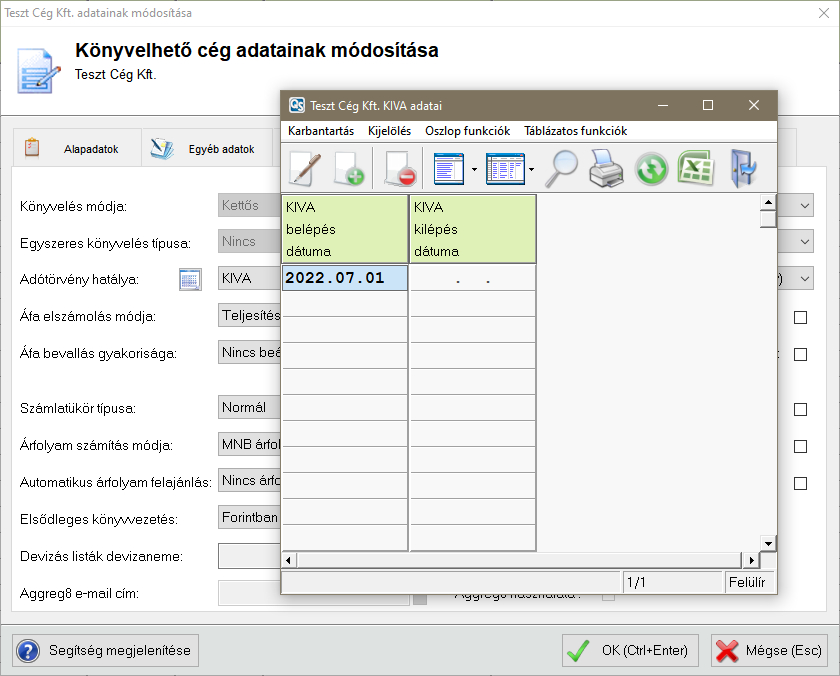 Az "Adótörvény hatálya" mező mellett található naptár ikonra kattintva megnézhetők, illetve karbantarthatók a KIVA hatálya alá eső időszakok. Fontos, hogy ebben a táblázatban idősorosan legyenek rögzítve az adatok. Ha az adótörvény hatályánál KIVA van kiválasztva, akkor ebben a táblázatban az utolsó, vagyis az aktuális sorban a belépés dátumát ki kell tölteni, de a kilépés dátumát üresen kell hagyni. Amikor a cég kikerül a KIVA hatálya alól, akkor ki kell tölteni a kilépés dátumát az utolsó sorban.