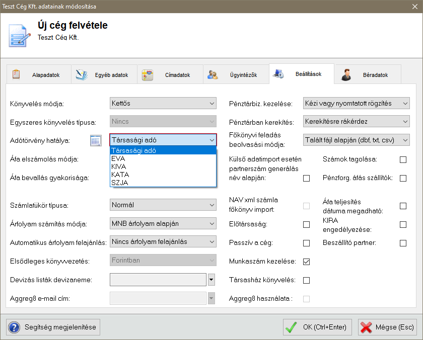 A következőt beállítást kell elvégezni: a "Karbantartás/Könyvelhető cégek karbantartása" menüpontban az adott cégen állva a szóköz billentyűvel lenyomásával meg jelenik egy ablak. A "Beállítások" fülön az "Adótörvény hatálya" mezőben ki kell választani a megfelelőt (Társasági adó / EVA / KIVA / KATA / SZJA)