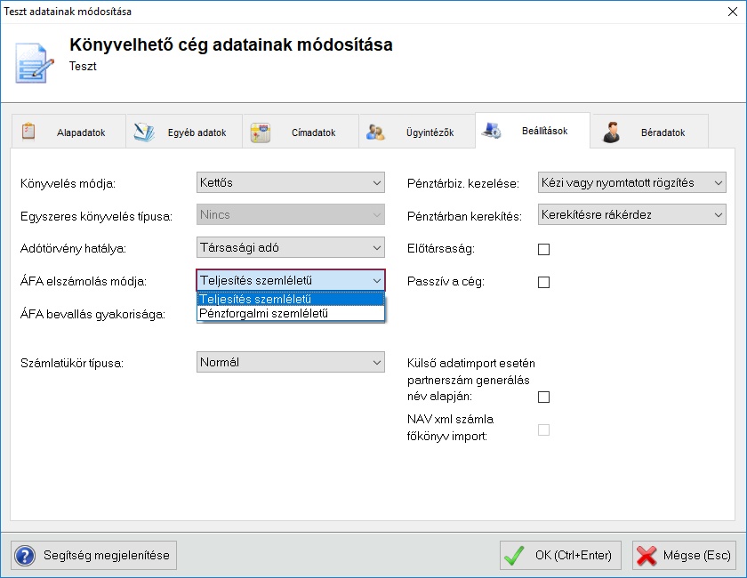 A következőt beállítást kell elvégezni: a karbantartás menüponton állva el kell indítani a könyvelhető cégek karbantartását, itt az adott cégen állva SPACE billentyű vagy az Aktuális tétel sor szerkesztése gomb lenyomásával FORM nézetre kell váltani. Felugró ablakon (FROM nézet) A beállítás fülön az alábbi beállítást kell elvégezni: Teljesítés szemléletű/Pénzforgalmai szemléletű áfa.